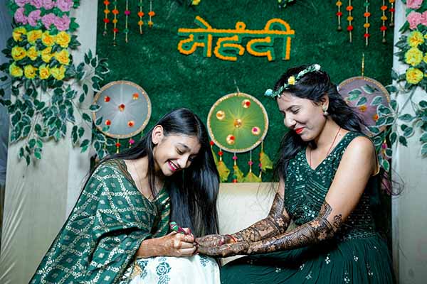 The Mehendi ceremony is of course incomplete without families coming together. Pose with your loved ones, holding hands or sharing a warm hug. You can take group photos with your family members, standing or sitting in the centre. Here the photographer will take candid shots to capture the emotions between the bride and the family.